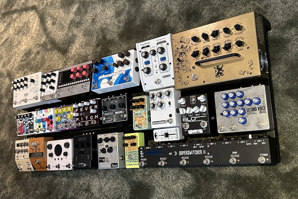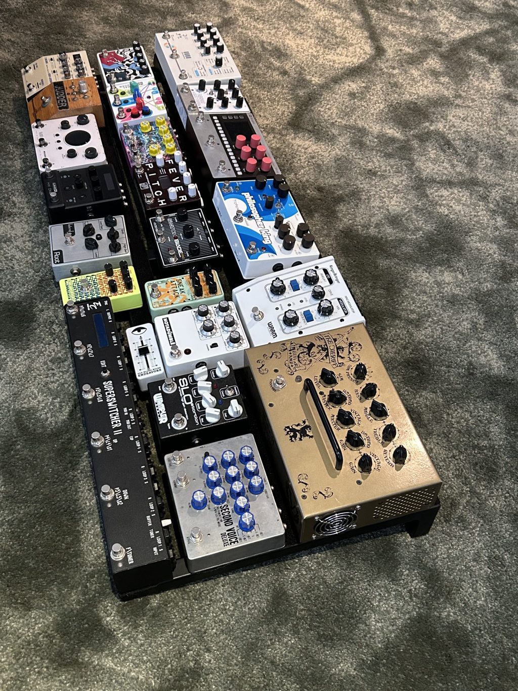 Above: My primary ‘go-anywhere’ split stereo pedalboard, featuring a pedal amplifier (top right) and multiple routing and switching systems allowing it to be used as a stereo board for dual inputs/outputs, conventional guitar effects board, or stereo mixbus/auxFX.