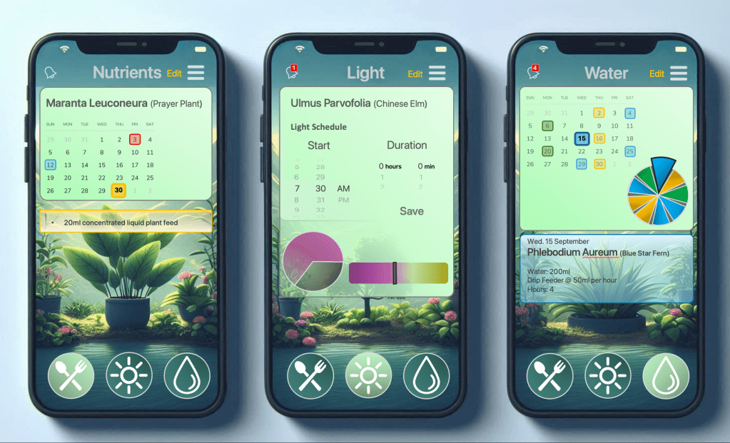 The mobile app enables the user to monitor and manage all aspects of plant growth and health.